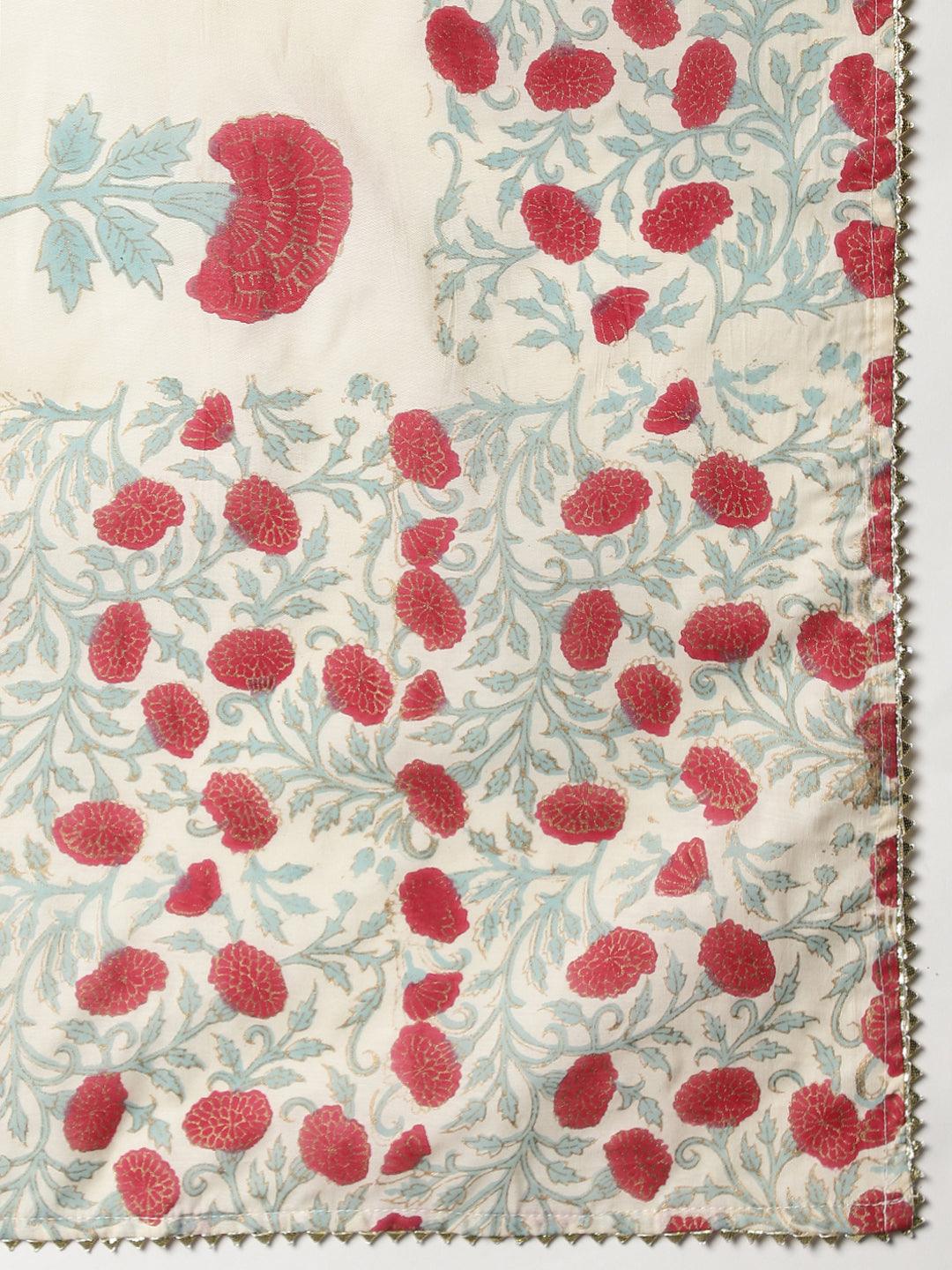 Cream Chanderi Floral Anarkali Kurta Pant Set with Dupatta