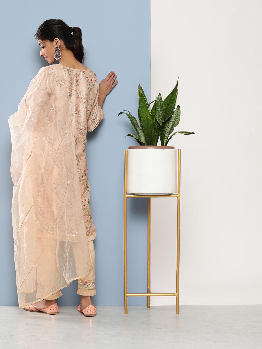 Poly Chanderi floral Printed Kurta Pant Set with Organza Dupatta